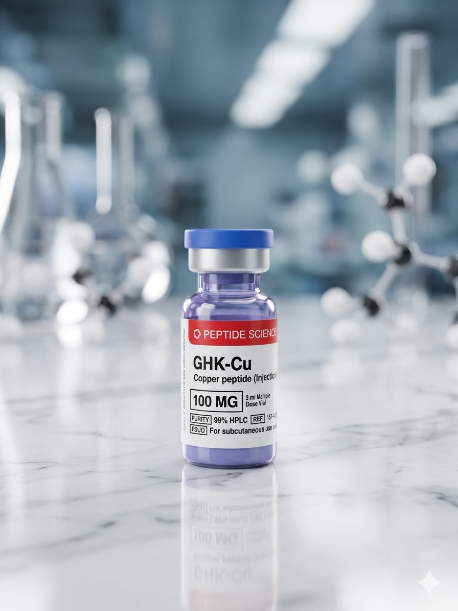 GHK-Cu (Peptídeo de Cobre) 100mg do Laboratório Peptide sciences. Peptídeo anti-envelhecimento premium para rejuvenescimento da pele, estímulo ao colágeno e regeneração celular. Produto importado dos Estados Unidos com certificação de qualidade.