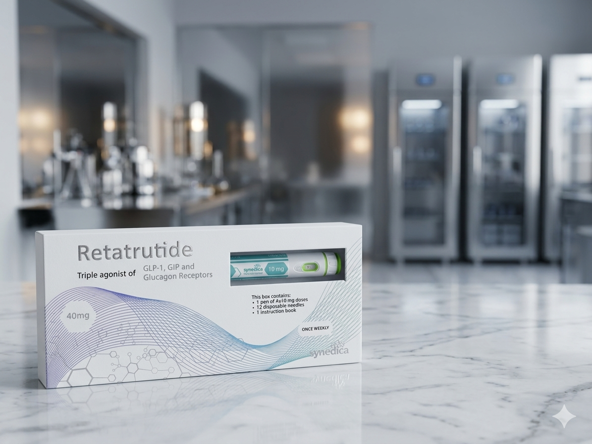 Retatrutide 40mg da Synedica. Caneta pré-preenchida com 4 doses de 10mg. Triplo agonista de receptores GLP-1, GIP e Glucagon para emagrecimento avançado. Envio imediato do Brasil — sem esperar importação! Produto disponível em estoque no Brasil.