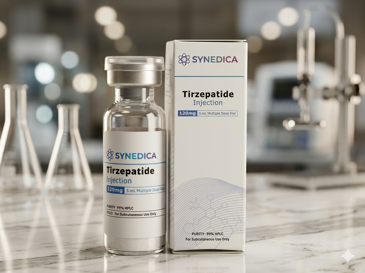 Super dosagem de Tirzepatida 120mg do Laboratório Oficial Synedica. Caixa com 1 vial de 120MG, A maior concentração de Tirzepatida disponível no mercado. Ideal para protocolos de longa duração. Produto original com envio rápido para todo o Brasil.